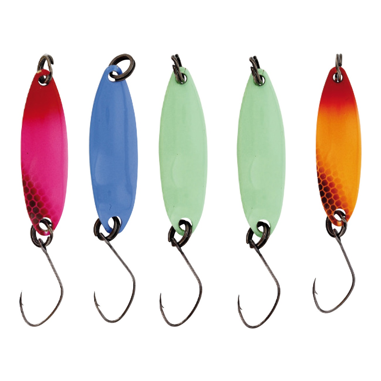 Das Set enthält 5 Blinker in verschiedenen Forellenfarben, die auf der Packungsrückseite aufgeführt sind. Die Farbauswahl orientiert sich an den bewährtesten Tönen für das Forellenangeln - ideal, um verschiedene Farben direkt am Wasser zu testen.