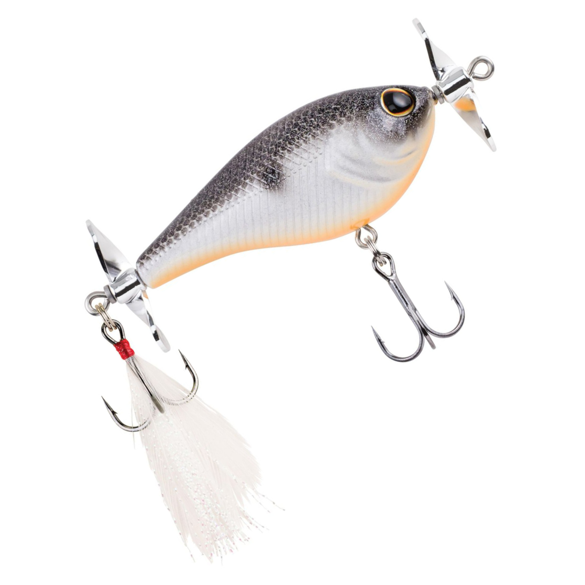 Durch die ausgeprägten Kunststoffpropeller entsteht bereits bei wenig Geschwindigkeit eine auffällige Sprühwirkung. Das schalenförmige Design sorgt für einzigartige Reflektionen und aktiviert so die Sinne der Räuber, selbst wenn kleinere Fische als Beute in der Gegend sind. Twitchen, Jerken oder gleiten lassen – dieser Hardbait spielt bei jeder Führungsart seine Stärken aus.