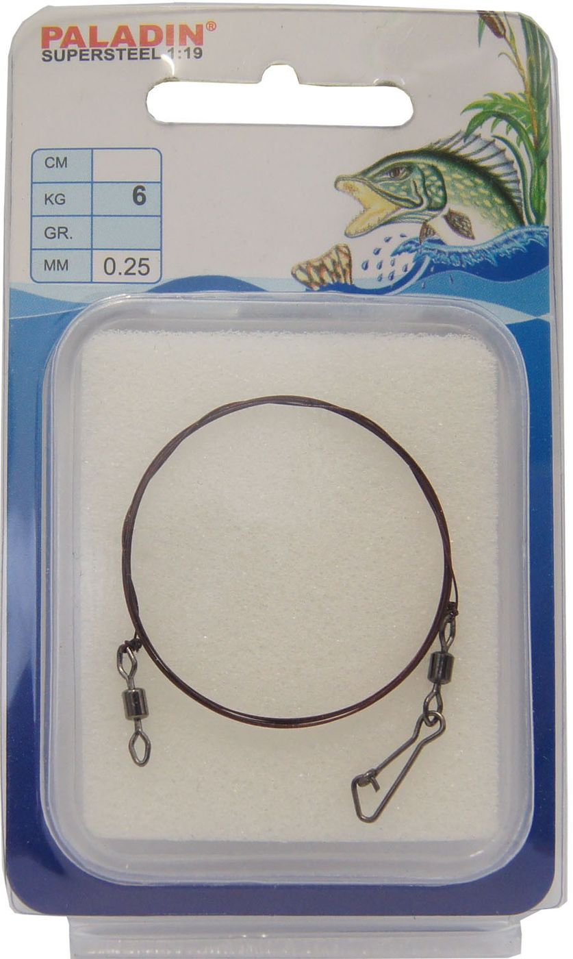 Das Supersteel Stahlvorfach mit Wirbel ist ein sehr gutes Vorfach, das 1*19 fädig ist und ideal zum Spinnfischen ist.